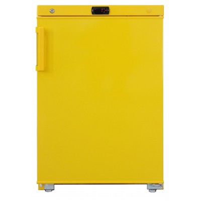 Холодильник для хранения медицинских отходов класса Б Бирюса 1502 в аренду, габариты ширина 620 мм, глубина 580 мм, высота 890 мм, холодильник выполнен согласно требованиям СанПиН 2.1.3684-21. Он окрашен в желтый цвет, укомплектован одним 35 литровым баком и двумя 3-х литровыми баками, для медицинских отходов класса «Б», имеется бактерицидная лампа для дезинфекции емкостей и внутренней камеры, для защиты от несанкционированного доступа оснащен замком.